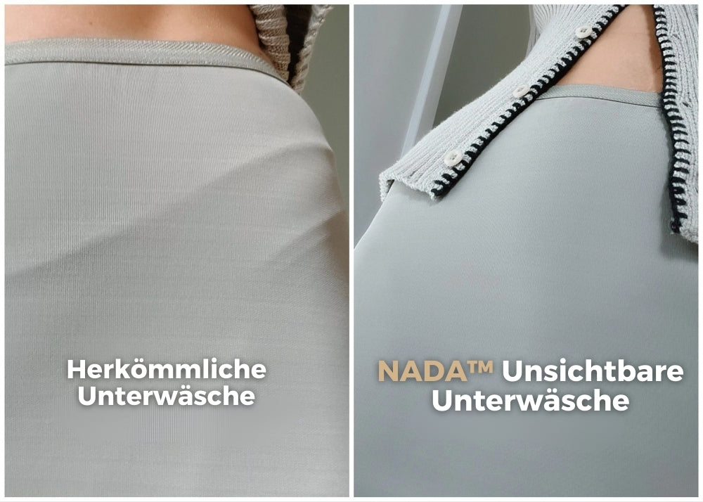 Das ist Nada: Unsichtbare, super leichte & nahtlose Unterwäsche die keinerlei Slip Linien oder Abdrücke verursacht. Ob unter deinem Lieblingskleid, deiner Leggings oder dem Business-Blazer: NADA bleibt unsichtbar, während du sichtbar strahlst.